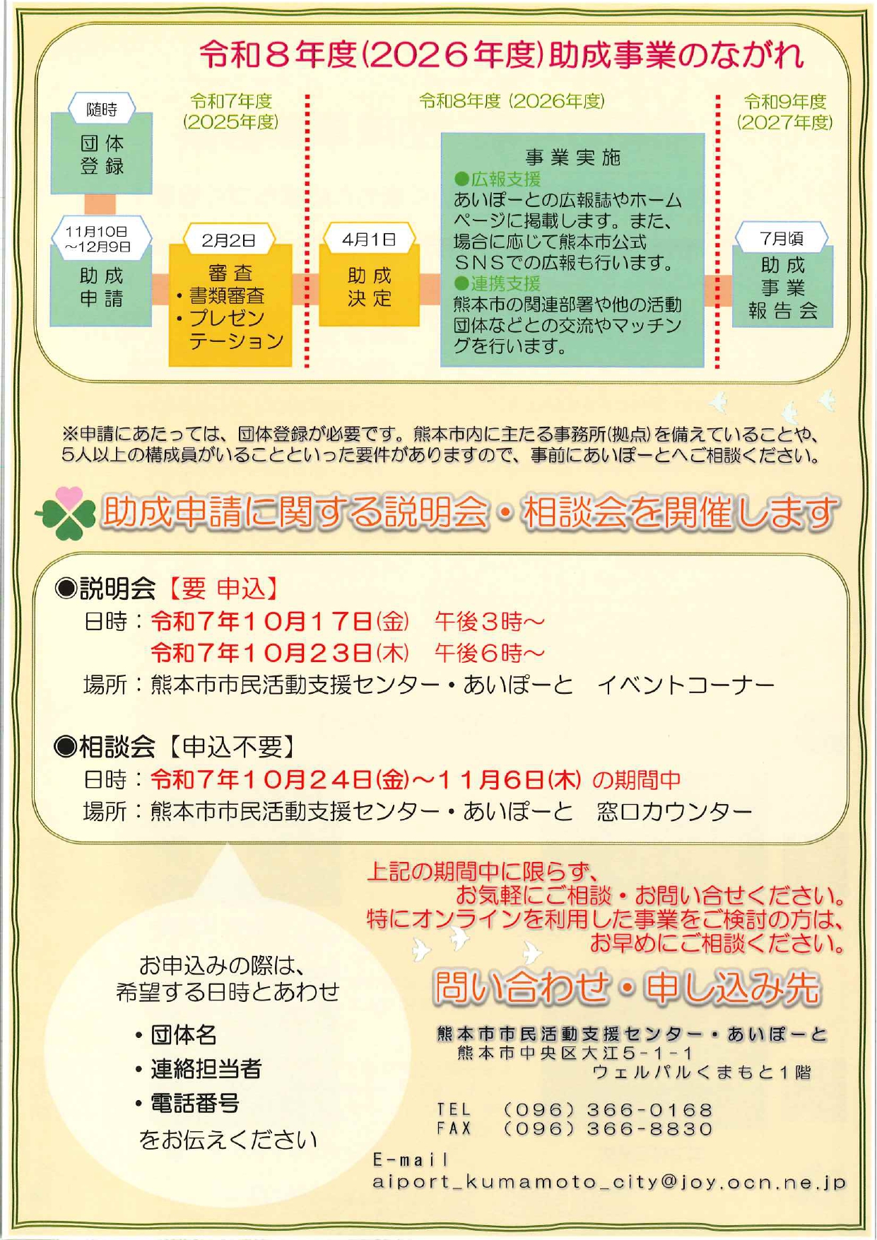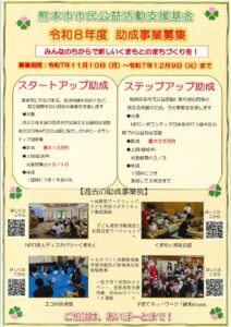 2025年10月3日 / 最終更新日 : 2025年10月3日 ipponWebMasterAdm お知らせ 熊本市市民公益活動支援基金令和8年度助成事業募集のお知らせ 熊本市から助成事業募集のお知らせです。是非ご覧ください。